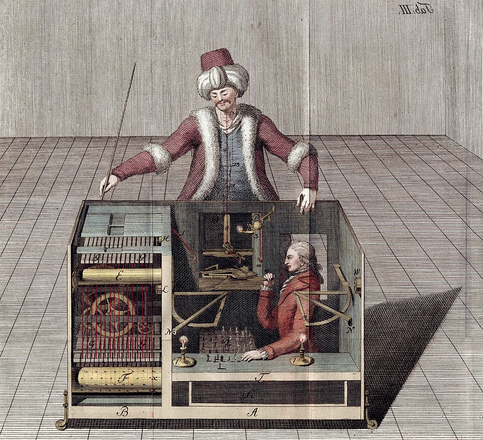 Wolfgang von Kempelen’s “Mechanical Turk”, a chess-playing automaton, tours Europe defeating most challengers. Humans are horrified. It is later exposed as a hoax, with a strong chess player hidden inside.